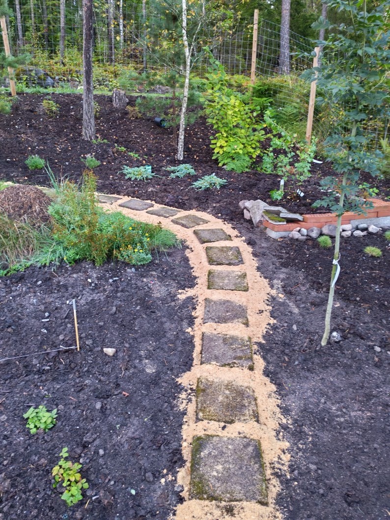 Between the road leading to the house and the garden lies a pine hillside, part of which we have taken into cultivation and called our forest garden. In summer 2025, it slowly and intuitively transformed into the land of childhood fairy tales. Our dearest stories and fragments of mythology inspired us to gather plants and trees with enchanting tales connected to them. Thorny roses covering Sleeping Beauty’s castle and stone dwarfs guarding Snow White took the lead roles. The sweetest part is that in the middle of everything are benches where you can simply sit and breathe in a fairytale-like peace.